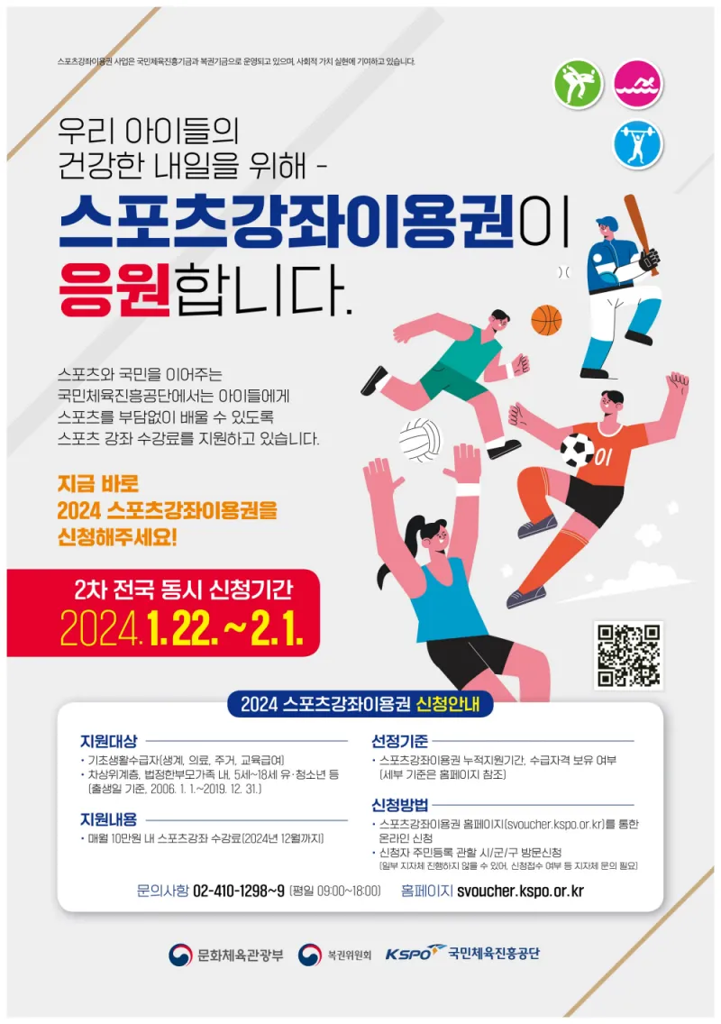스포츠강좌이용권 신청기간은 2024년 01월 22일부터 02월 01일까지입니다. 신청방법은 아래의 링크로 접속하여 간단한 정보만 입력하면 됩니다.