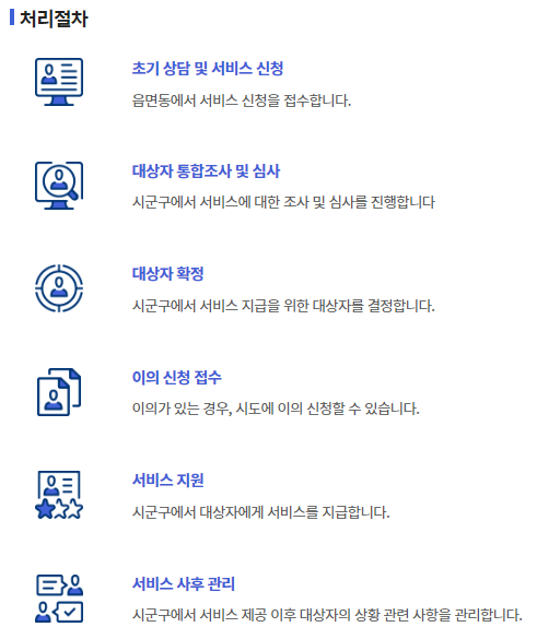 신청 후 처리절차는 초기상담 및 서비스신청 → 대상자 통합조사 및 심사 → 대상자 확정 → 이의 신청 접수 → 서비스 지원 → 서비스 사후 관리로 이루어져 있습니다. 위의 그림을 클릭하여 자세히 보시기 바랍니다.